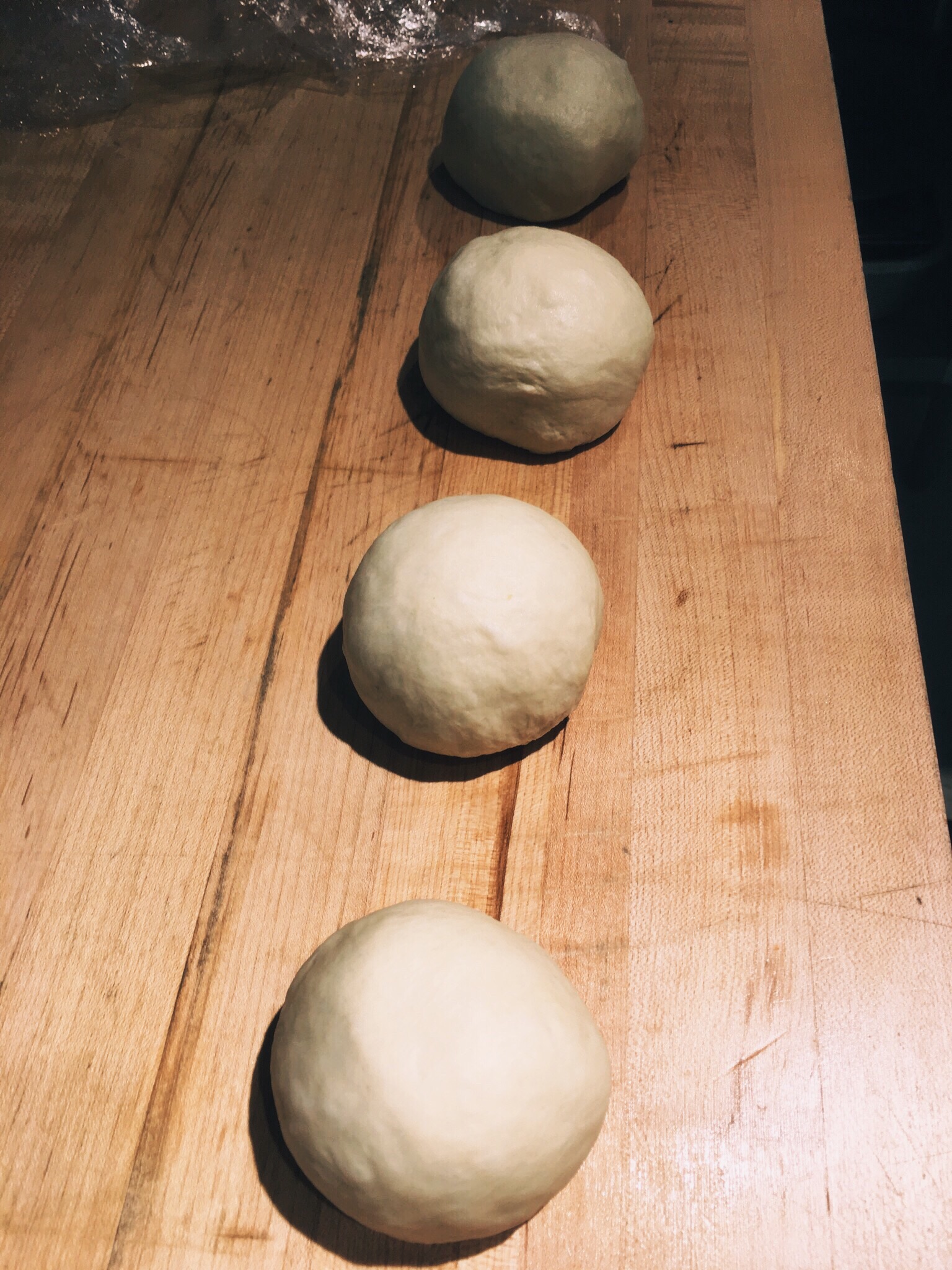 6. Punch down and cut into 4 equal sized pieces. Take each piece and form a smooth “round”. Place rounds on a floured surface and cover with a towel or plastic wrap to keep from drying. Let rest for at least 10 minutes.