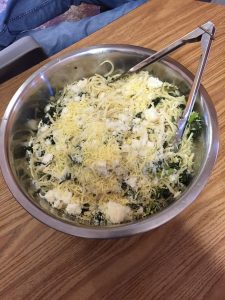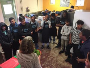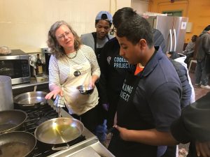 During our class she chose a robust, yet light recipe for a delicious meal. Mixing a handful of ingredients led to a dish that fed many, and did not deplete your cash. What you need: Kale, pasta, garlic, olive oil, parmesan, red chili flakes, salt, and pepper. The students started off by learning some interesting facts about the health benefits of kale and started smashing and slicing some garlic. Beautiful leaves of kale were sliced to add to the pan later. Quick Tip: Don’t cut your kale too small, when cooking the kale will wilt (shrink) so you can stuff the pan.
