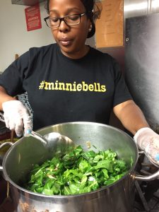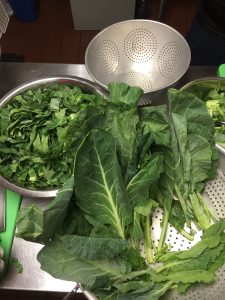 Chef Fernay, a San Francisco native, learned this corn bread recipe from her grandmother when she was growing up in the Fillmore. The class worked in groups and some worked on the sausage, onions, and garlic, others worked on the greens, and cornbread. QUICK TIP: Wash the collard greens after cutting them, that way you can fit more in your colander.