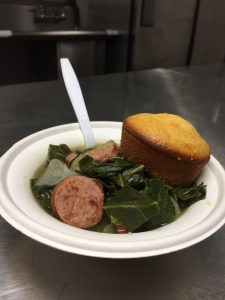 After about 20 minutes the lid from the pot was removed and everyone’s head turned towards the giant pot. Scents escaping the pot and oven caused great anticipation and excitement as the time to eat came closer and closer. A low temperature and long cooking time will make the dish even tastier. In due time, with patience, the flavors will be maximized. As the timer went off for the corn bread, the tops were just inching out of the tray with golden perfection. Bowls were filled with hearty amounts of sausage, onions, and greens. The flavors of the stew coupled with the cornbread was impeccable. The broth, also know as pot-liquor (Fernay’s favorite part), left warm smiles on everyone’s faces.